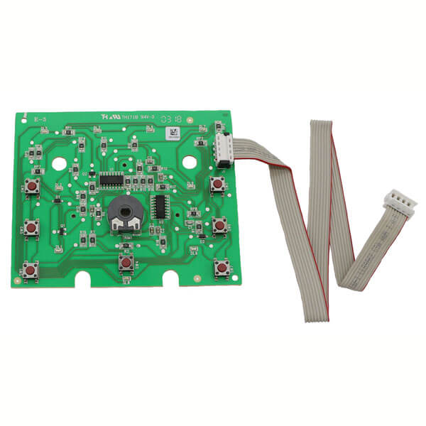 Bedienplatine komplett mit Anschlusskabel, Stecker und Drucktasten. Die Platine befindet sich vorne in der Bedienblende.