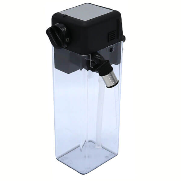 Die Milchkaraffe komplett mit Deckel, Aufschäumer und Milchansaugrohr.