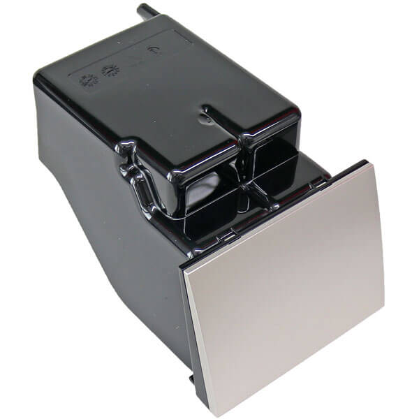 Kaffeesatzbehälter in Schwarz mit silberner Blende. Der Tresterbehälter sammelt den Kaffeesatz nach dem Brühvorgang.